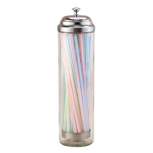 Keep straws ready to be used in the nostalgic, diner-style Retro Glass Straw Dispenser. Commercial-quality construction with a glass body and chrome-plated lid. Includes straws.