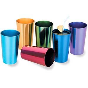 Retro kitchenware recalls simpler times. Shiny, '50s-style pitcher (80 oz.), tumblers (16 oz.) and ice-cream bowls (16 oz.) come in a rainbow of colors that are sure to brighten any BBQ, picnic or meal. Sturdy, non-breakable aluminum keeps food and drinks cool and is ideal for indoor or outdoor use. Hand wash.